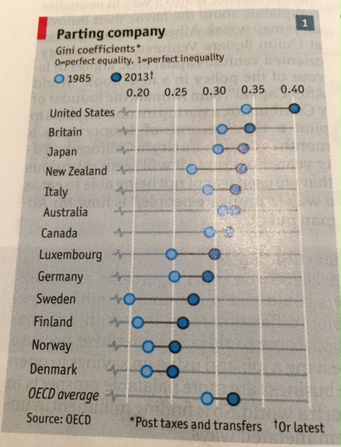 Latest issue of the Economist features a discussion on State stipends , but what caught my eye is a table of Gini Coefficients and changes from 1985 to 2013.
